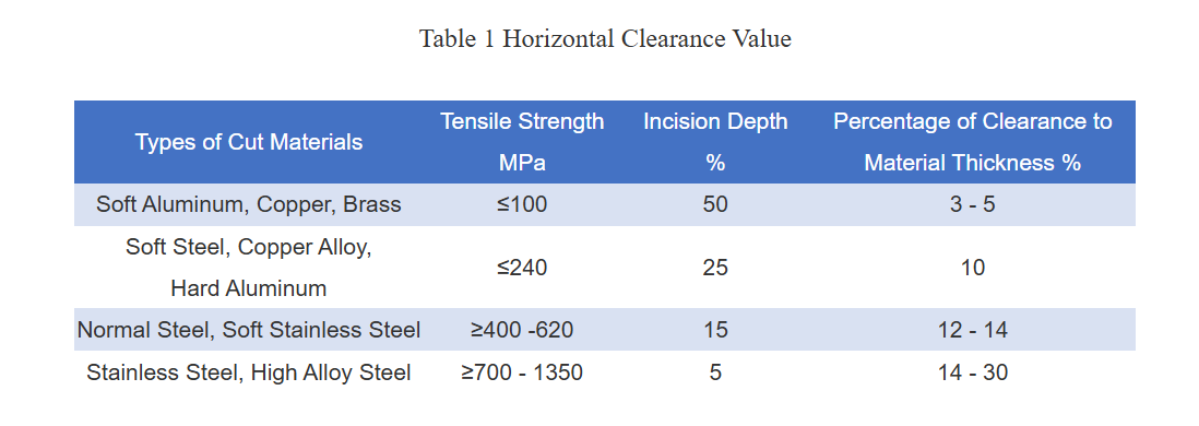 Clearance is the most important factor in sheet metal slitting. The purpose of special requirements on the accuracy of slitting tools, bonded stripper rings and thin spacer rings is to make the clearance precise and constant, so the choice of clearance is very important. Refer to Table for the recommended value of the clearance percentage used for related material. It is hoped tat he relevant operators can find out the correct clearance value or the percentage of clearance to material thickness based on this It can be said that the best clearance value suitable for your own factory is ultimately obtained by the operator repeatedly in the actual production. The clearance values in the table are only for the operator’s reference.